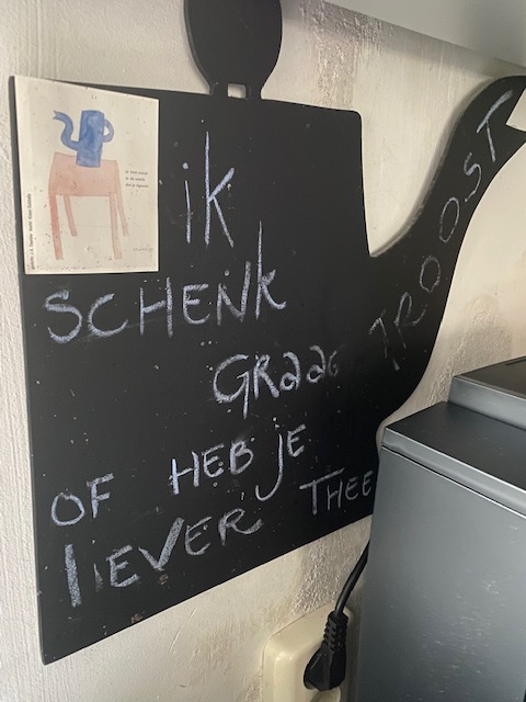 Inmiddels staat er een nieuwe. We kijken er vol bewondering naar, wat dit ding allemaal kan. Geen tv-programma kan er aan tippen. Ook als je niks doet, spoelt het ding om het kwartier door. Dat moet nog anders in te stellen zijn. We moeten nog een beetje aan elkaar wennen.