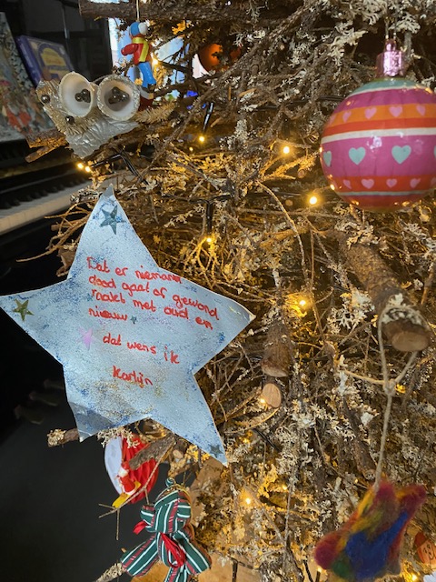 Vertederend lees ik de tekst die Karlijn op een kerstster schreef: dat er niemand dood gaat of gewond raakt met oud en nieuw. Toen ze jonger was, nam ik haar eens mee naar een kerstborrel van GGZ, waar je ook een wens in de boom mocht hangen. Tussen de hartverwarmende wensen van vrede, nooit meer oorlog, geen ziekte of pijn hing die van dochterlief: een nieuwe jurk. Ook mooi…