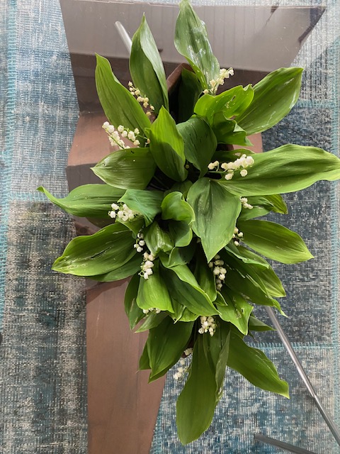 Ik moet ook altijd denken bij de lelietjes van dalen aan iemand die me ooit vertelde dat zij in haar trouwboeket persé deze prachtige geurbommetjes wilde, ook al was het niet het seizoen. Zo stond ik vorige week weer aan haar deur. Ook ik houd van vertrouwd. Haar man doet open en fluistert me toe dat ze heel ziek is en de vooruitzichten somber. Wat een cadeautje dat ze toch in staat is me een dag later een mail te sturen. Ik hoop van harte dat ik volgend jaar weer met een bosje aan haar deur mag staan.