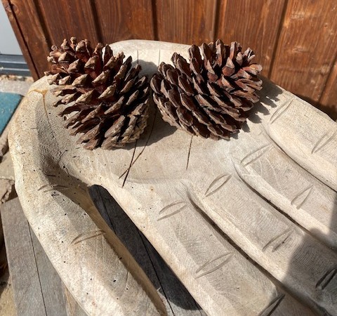 Begin juni zijn we in Bretagne. Daar aan de kust in een parkje liggen grote open dennenappels. Huppakee, in de tas ermee. Eenmaal thuis krijgen ze een plekje op een houten hand. Een mooi souvenir, die je even terugbrengt naar het aangename vakantieadres. Afgelopen zaterdagavond trakteert een wolkbreuk boven Assen met voorafgaand een plotselinge en korte storm ons op een plens water. De volgende dag zitten de dennenappels helemaal dicht. Misschien is dit een heel normaal natuurverschijnsel, maar we staan ons erboven uitgebreid te verbazen. Natuurlijk zien we wel vaker dichte dennenappels. Ik geloof dat ik dan denk dat die nog niet rijp zijn, ofzo. geen idee eigenlijk. En nu een paar dagen later zijn ze weer een stuk opener. Nog niet zo open als vóór de bui van afgelopen zaterdag, maar met dit mooie weer geef ik het zeker een kans van slagen. Niet heel wetenschappelijk onderbouwd, maar met gewoon boerenverstand kom je toch ook een heel eind.