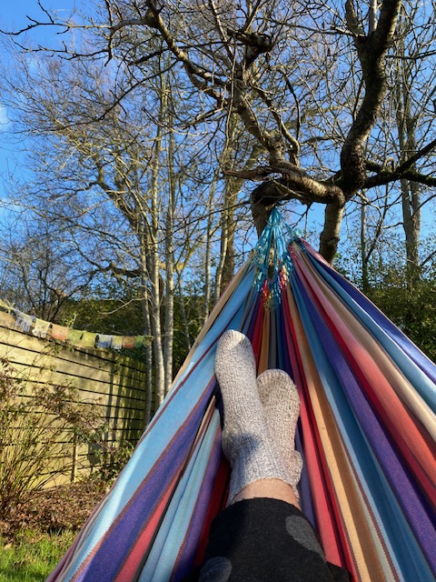Als de zon achter het dak is verdwenen, straalt-ie precies op dat plekje boven de bleek waar de hangmat kan. Doe es gek! Voorzichtig klim ik in de mat. Houdt het stof me? En de dood uitziende pruimen? De stammen kreunen onder mijn gewicht. Maar ik bungel genoeglijk, met ingehouden adem. Hoewel genoeglijk? De wind maakt het hangen matig. Ik zie dat ook de sneeuwklokjes hun jasjes nog strak om hun lijfje houden. Het gezang van koolmeesjes klinkt ritmisch door de koude lucht. Het spul vliegt af en aan. Ze worden niet gehinderd door blad aan de bomen en kunnen alvast een plek om straks te nestelen uitzoeken. Als mijn vingertoppen blauw zien en ik lijfelijk vernikkel van de kou, ruim ik de hangmat weer op in de schuur op zo’n plek, dat-ie makkelijk weer te pakken is. Ik heb de smaak te pakken. Fijn hoor, mijn eerste zweefteefactiviteit nog nét in Janniejarie. Echt te koud, maar dwangmatig als ik met de hangmat ben…