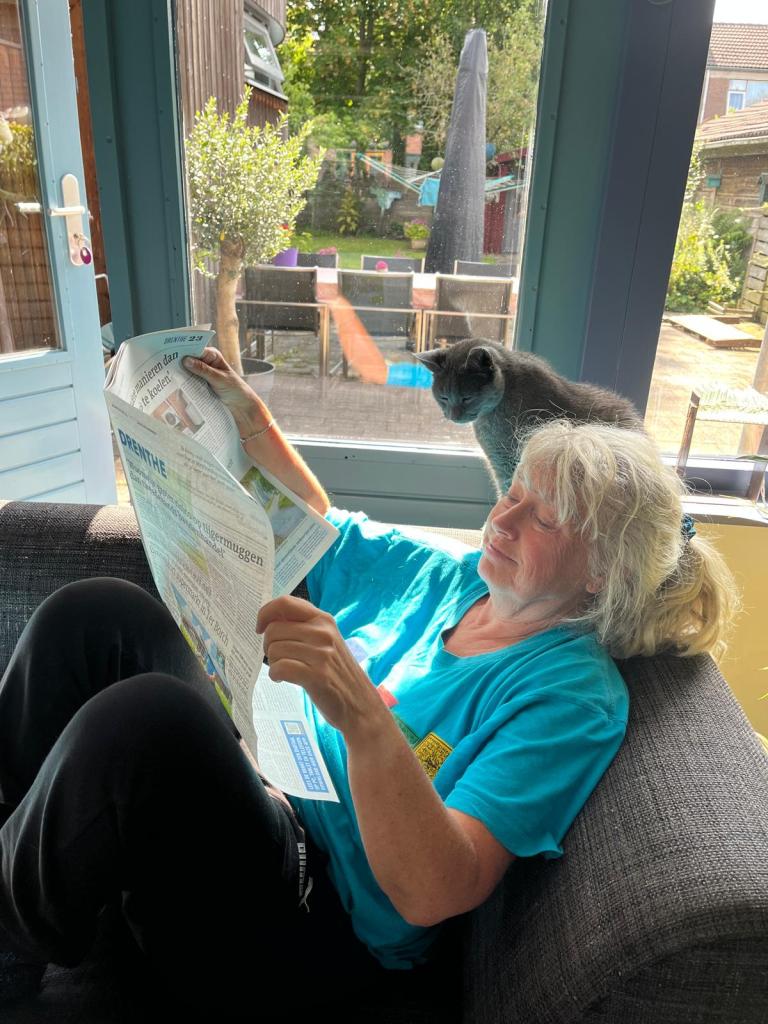 Kijk Luutje, je kunt het best. Samen krantje lezen. Naast mij in plaats van óp mijn zachte rompslomp bovenop het nieuws te zitten. Gisteren heeft hij gelnageltjes gekregen. Die van hem zijn namelijk zó scherp dat we inmiddels van top tot teen onder de krassen zitten. Gelnagels zijn veel huidvriendelijker. Hij wil graag roze en dat hebben we toegestaan. Met op het pinkje een klein nepdiamantje. Ze gaat meteen naar de buurmeisjes om het te laten zien. In no time komt hij terug met een opgezet oog. Blijkt dattie door Fluks op z’n oog is getimmerd. We leggen natte lapjes op zijn oog, wat langzaamaan nóg blauwer kleurt dan zijn eigen blauwe-Rus-blauw. Hoewel ik onze buurpoezen echt in mijn hart heb, ben ik toch op hoge hakken verhaal gaan halen. Of dit nou nodig is! Tja, niets menselijks is de buurpoezen vreemd. Vrouwelijk staaltje jaloezie. Leuker kun je het soms niet maken.