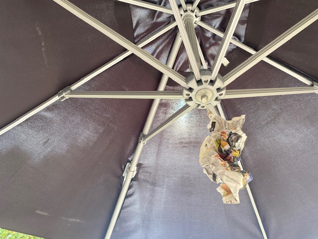 Omdat we aan tafel worden vergezeld door wespen, hang ik een zelfgecreëerd wespennest op. Manlief wijst naar zijn voorhoofd en ook een meeëter lacht schaapachtig. Het is de bedoeling dat de wesp het idee krijgt dat hier al een wespennest hangt en hij onder onze parasol niets te zoeken heeft. En verdomd als het niet waar is: google verwijst naar een soort van witte wensballonnen, die overal online te scoren zijn. Heel eerlijk: het heeft nog niet direct geholpen. Misschien staat het nieuws op deze verfrommelde prop uit het Dagblad van het Noorden ze niet aan. Maar om nou mijn neus in dit wespennest te steken…