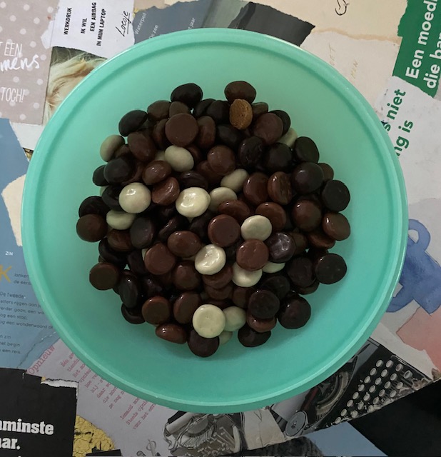 Ik herinner me dat ik tegen de boys zeg, dat het heel normaal is om, als het vanavond donker is, je je af te vragen of Piet eigenlijk wel écht dood is. Dat hebben we wel goed gezien! Echter, elke keer als ik vandaag in de kelder moet zijn, doe ik de deur voorzichtig open en tuur voorzichtig naar beneden. En in dat kader mag ik af en toe een greep uit de pepernotenpot op tafel pakken. Je weet wel, die met chocolade omhuld. Deze fijne vorm van bolletjes slikken geeft me vandaag troost. Nu ben ik de zestig al gepasseerd, maar voor muizenissen geldt kennelijk geen leeftijdsgrens. Tuurlijk, Venna geeft geen krimp en ligt er nog net zo levenloos bij als vanmorgen. Ja duh, wat denk je dan? Toch ben ik een soort van angstig bang dat Venna boven aan de trap staat met één oog dicht en de andere half open naast haar mondhoek. Het hoofdje slap bungelend op de drempel. Oh jakkes, weg met fantasie! En dan moet de nacht nog beginnen.
